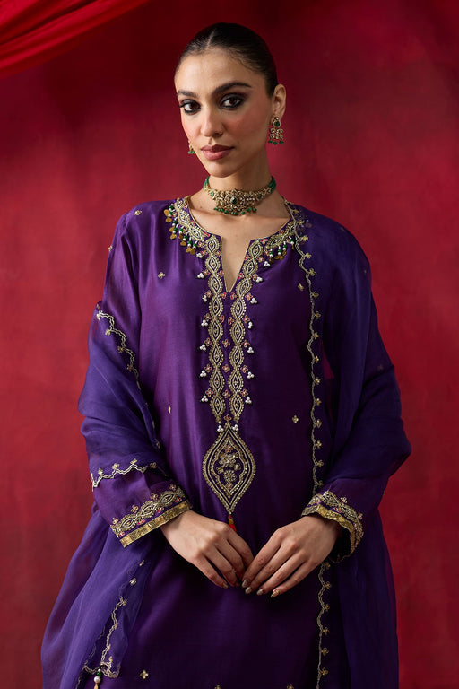 Pink Thread And Hand Embroidered Straight Kurta In Silk Chanderi Fabric Paired With Embroidered Silk Organza Purple Dupatta Comes With Cotton Silk ...