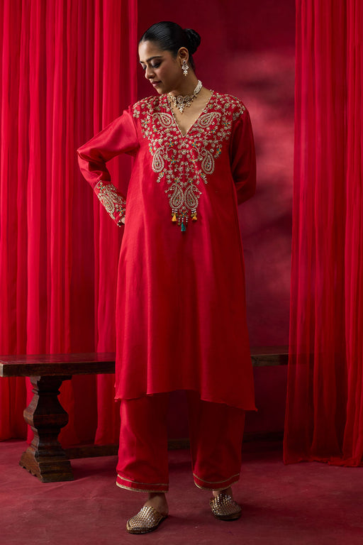 View full detailsRed Thread & Hand Embroidered A Line Kurta In Silk Chanderi Fabric Paired With Embroidered Silk Organza Red Dupatta Comes With Silk Chanderi Em...