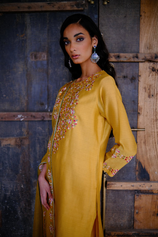 View full detailsYellow multi colored thread embroidered flared Kurta Paired with yellow wide leg pants and sage green embroidered dupatta Fabric : Kurta & P...