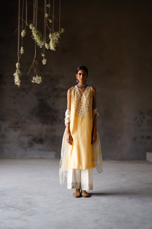 View full detailsYellow sleeveless mirror embroidered staright Kurta Paired with wide leg silk chanderi Ivory Pants with embroidery on the hem It is paired w...