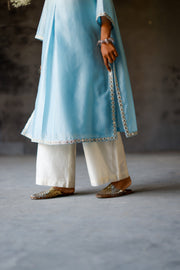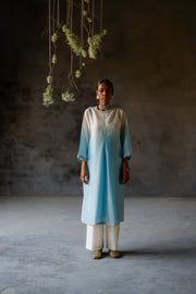 • Ivory Blue Ombre silk chanderi front pleated Kurta with slit on the sides