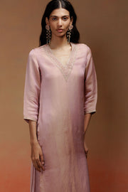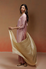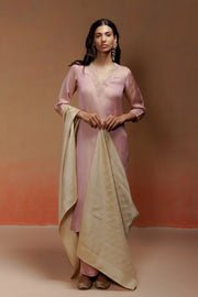 This set features a calf-length pink jacquard kurta with full sleeves. The jacquard weave repeats in three stripes of geometric patterns. A V-neckline is highlighted with zari and sequin embroidery for a refined touch. It is paired with simple straight shantoon pants. An ivory silk jacquard dupatta completes the look with understated elegance.
