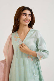 Mint Floral Zari Tissue Angrakha with Narrow Pants is an exceptional choice for anyone seeking elegance and tradition combined with modern sophistication. Its intricate craftsmanship and luxurious design make it a must-have for festive wardrobes. -This set contains 2 pieces - Angrakha and Pant. -Kurta featuring delicate machine embroidery work and cutwork along the edges. -Paired elegantly with Narrow Pants. -Includes a coordinating Dupatta for a complete ensemble.
