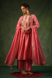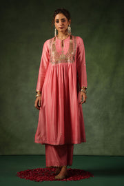 This 2pc kurta set comes with heavily embroidered zardosi yoke and butis spread all over the kurta. The hem of the sleeves and pants are embellished with gold tikki hangings. Optional embroidered organza dupatta available on request.