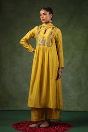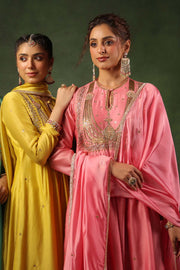 This 2pc kurta set comes with heavily embroidered zardosi yoke and butis spread all over the kurta. The hem of the sleeves and pants are embellished with gold tikki hangings. Optional embroidered organza dupatta available on request.