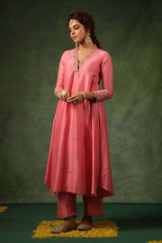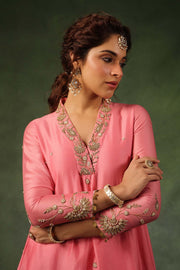 This 2 pc kurta set comes with zardosi embroidery on the overlap neckline, sleeves and butis spread all over the kurta. The hem of the sleeves and pants are embellished with gold tikki hangings. Optional embroidered organza dupatta available on request.