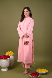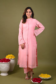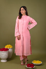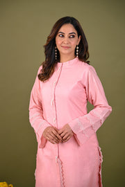 Pink kurta featuring hand embroidered lace detailing and beaded fringe buttons. Paired with matching plain pant with lace detail on hem.