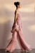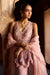 A charming Rose Pink peplum adorned with intricate floral embroidery, accompanied by subtly highlighted flared pants, and elegantly paired with a ruffle-edged dupatta.