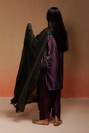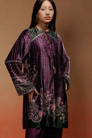 A short velvet kurta featuring a floral paisley print with delicate hand touches. Paired with a solid purple salwar in modal satin and a sheer gold butti organza dupatta for a festive finish.