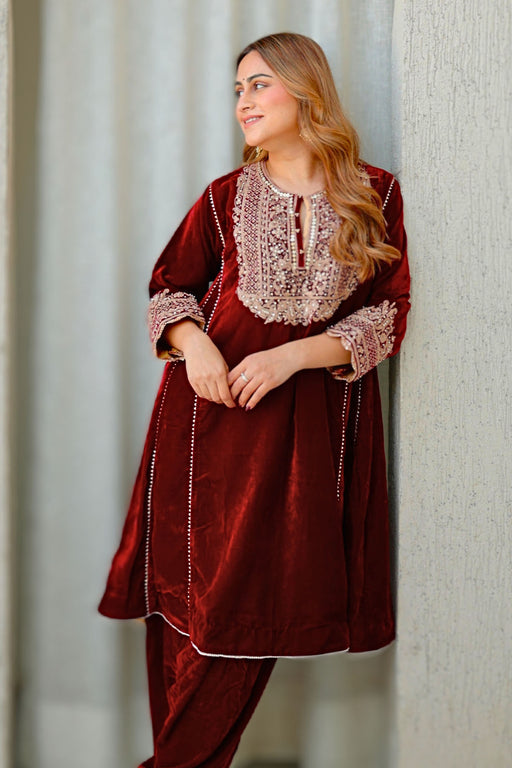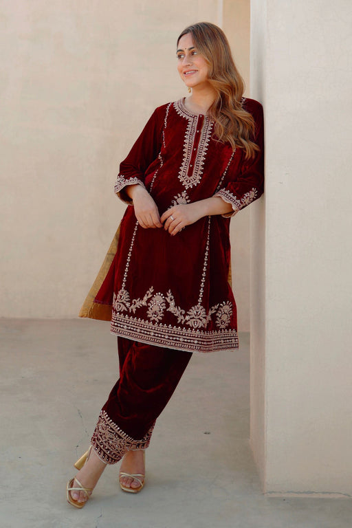 View full detailsThis short straight ensemble is crafted from luxurious pure silk velvet, paired seamlessly with a traditional Dogri salwar....
