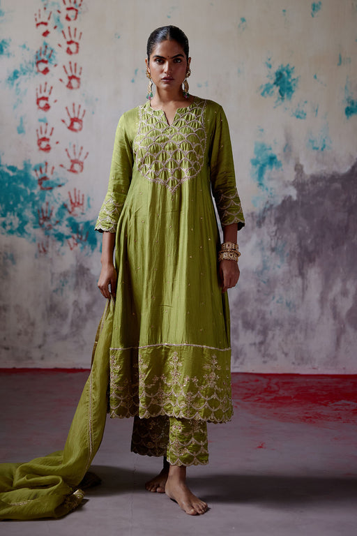 Olive layered zardosi and moti scallops embroidered on hem of pane...