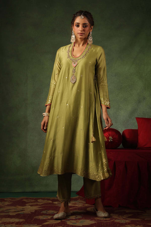 View full detailsThis 2 pc kurta set comes with zardosi embroidery on the overlap neckline, sleeves and butis spread all over the kurta. The hem of the sleeves and ...