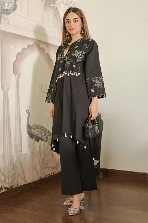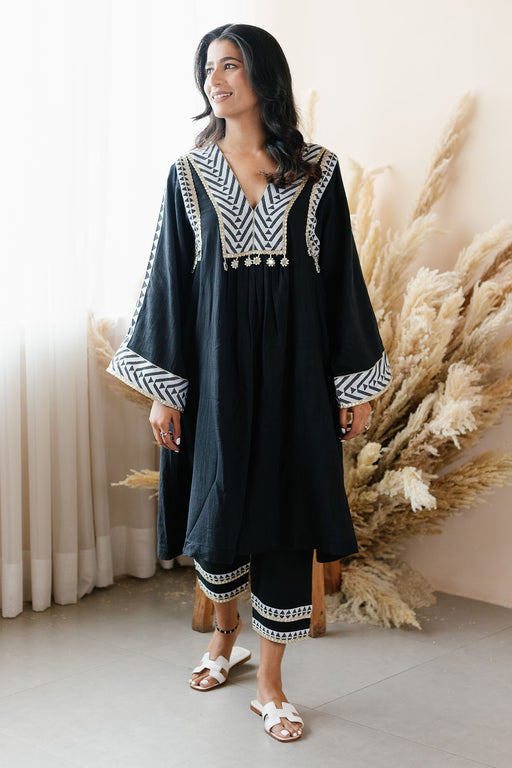 The easy A-line kurta features Aztec borders and mirror and pearl work along the neck and kaftan-style sleeves. The kurta is paired with matching p...