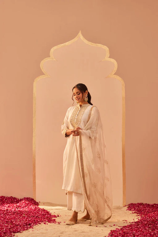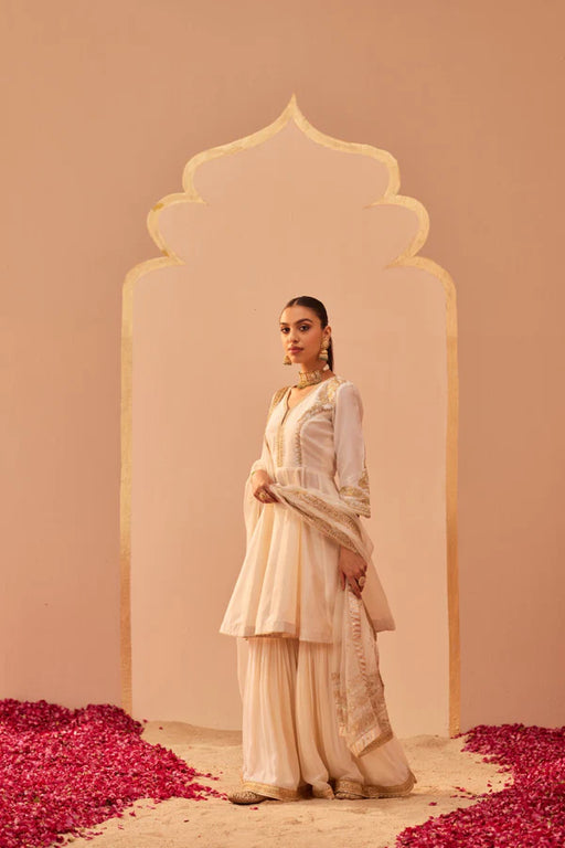 A dreamy kurta set in soft blush adorned with floral applique and organza scallop overlays embellished with delicate shells. The kurta is paired wi...