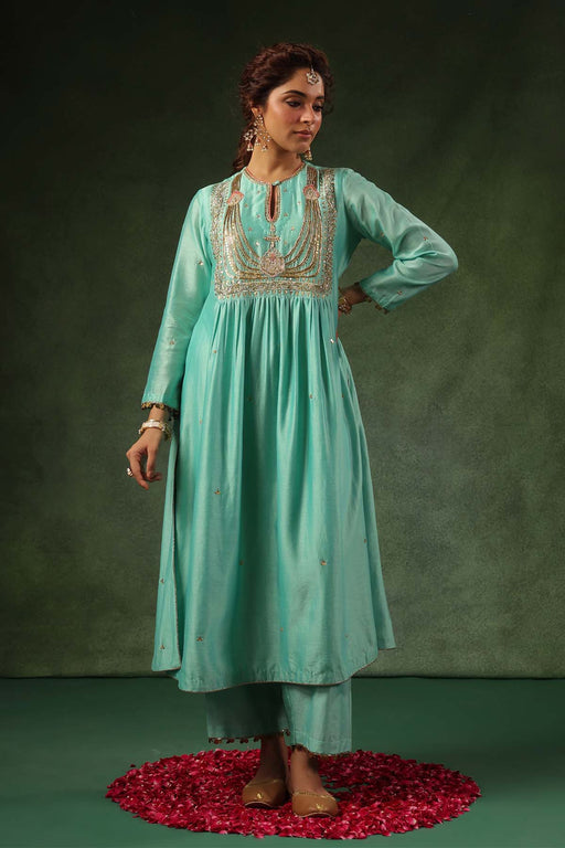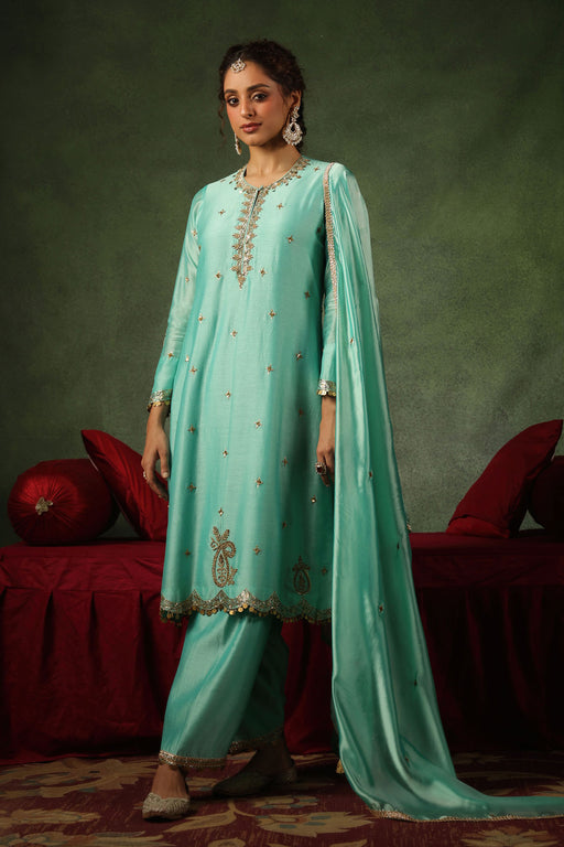 View full detailsThis 2 pc kurta set comes with zardosi embroidery on the neckline, sleeves and butis spread all over the kurta. The hem of the sleeves and pants ar...