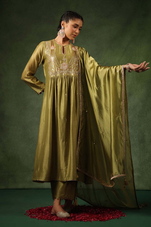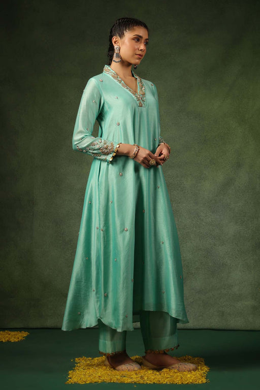 View full detailsThis 2 pc kurta set comes with zardosi embroidery on the overlap neckline, sleeves and butis spread all over the kurta. The hem of the sleeves and ...