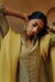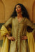 An olive green dual-textured jacquard flared kurta, cut to below-knee length, with delicate hand embroidery accenting the neckline and cuffs. Paired with a contrasting mustard tissue jacquard dupatta, this ensemble blends rich textures with festive elegance.