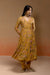 This set features a mango-colored printed anarkali with a graceful floral print. Hand touches on the yoke highlight the motifs, while multiple tassels crafted from stones and embroidered fabric add a charming detail. It is paired with a churidar and a contrasting pink organza dupatta finished with a scalloped border.