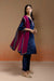 This set features a navy blue velvet kurta with full sleeves. The body is richly embellished with intricate zardozi handwork, adding depth and opulence. It is paired with matching velvet straight pants for a sleek finish. A contrasting purple organza dupatta completes the look, edged with velvet patches and detailed handwork on all four sides.