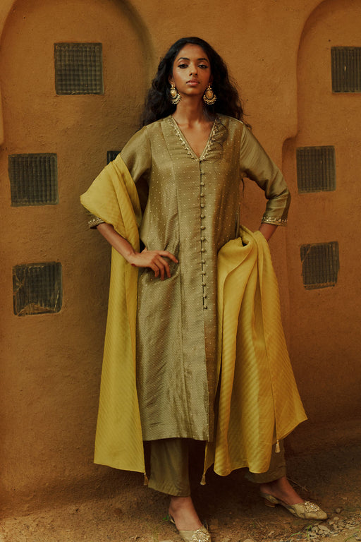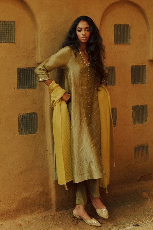View full detailsOlive Green Jacquard Flared Kurta with Mustard Tissue Jacquard Dupatta An olive green dual-textured jacquard flared kurta, cut to below-knee lengt...