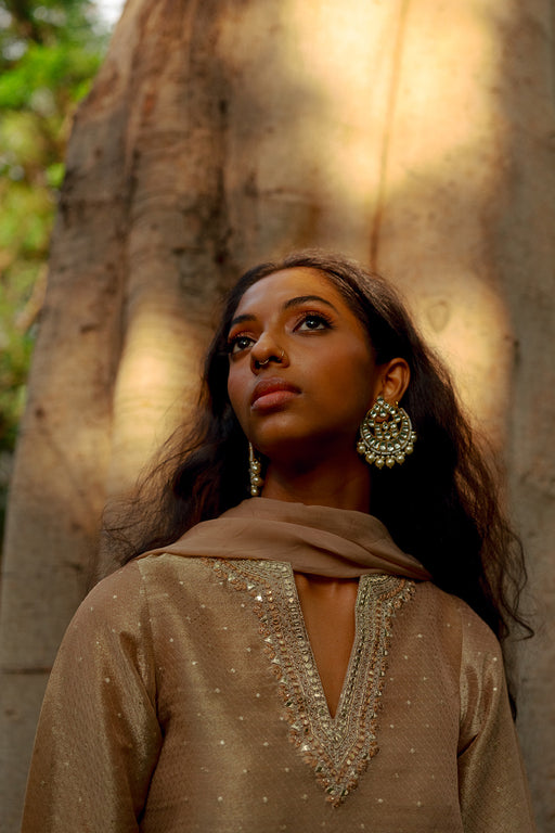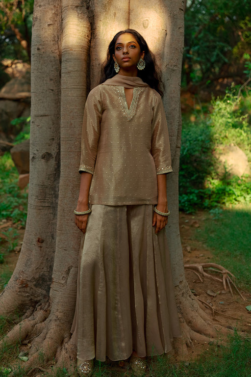 View full detailsAntique Gold Jacquard Sharara Set with Organza Dupatta A short full-sleeve kurta made from striped jacquard with a gold butti highlight, finished ...