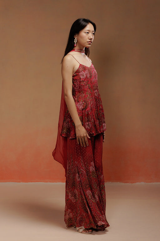 Wine Printed Kurta Set with Jacquard Sharara and Choker Dupatta The Reha Set features a wine short kurta with abstract floral print, elevated with...