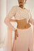 Kapda Dori's stunning blush pink armani satin fabric lehenga, beautifully adorned with pearl detail on belt. The lehenga features a full-length flowy look with high thigh slit. The blush pink color adds a touch of glamour and sophistication to your look, while the fabric texture ensures you feel comfortable all day or night long. It is styled with a blush pink satin blouse adorned with hand embroidery with pearls, crystals, sequens and soft net dupatta to complete the look.
