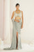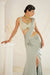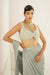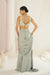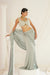 Kapda Dori's stunning Sage green ready to wear armani satin saree, beautifully adorned with intricate pearl details and with high thigh slit. The Sage green color adds a touch of glamour and sophistication to your look, while the soft satin fabric ensures you feel comfortable all day or night long. It is styled with a Sage green satin blouse fully embroidered with lot of hanging pearls and sequins.