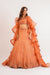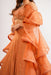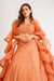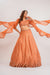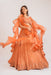 Extended Ruffle Sleeve Lehenga in Peach – Crafted from a luxurious blend of georgette and organza, this elegant lehenga features extended ruffle sleeves that add a touch of drama and fluidity. The soft peach hue enhances its feminine charm, making it a perfect choice for modern brides and festive occasions.