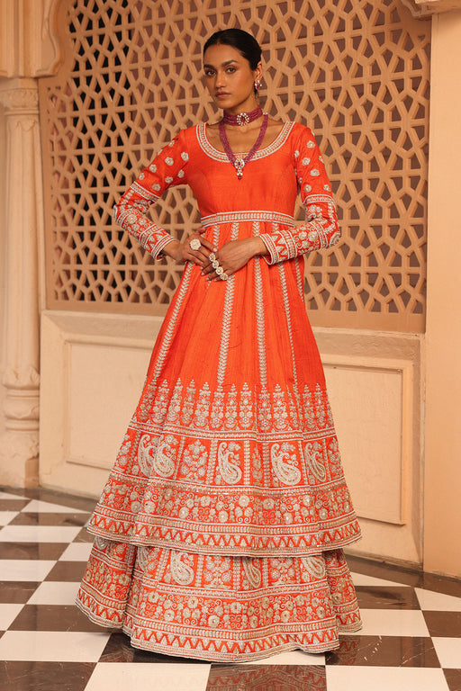 View full detailsOrange Lehenga set with solid skirt in silk organza and print blouse in cotton silk with printed balloon sleeves in silk organ...