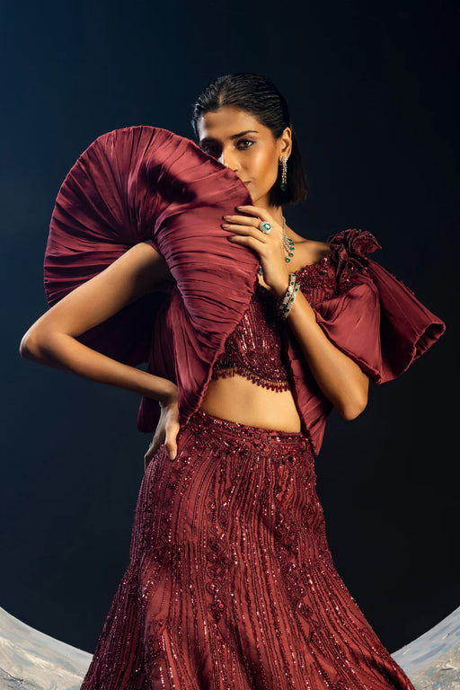 Glazed Wine top accentuated with feather details and dramatic drapes on shoulder, paired with an alluring dewdrop embroidered skirt