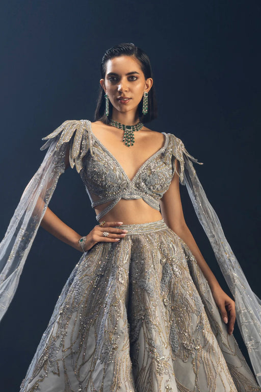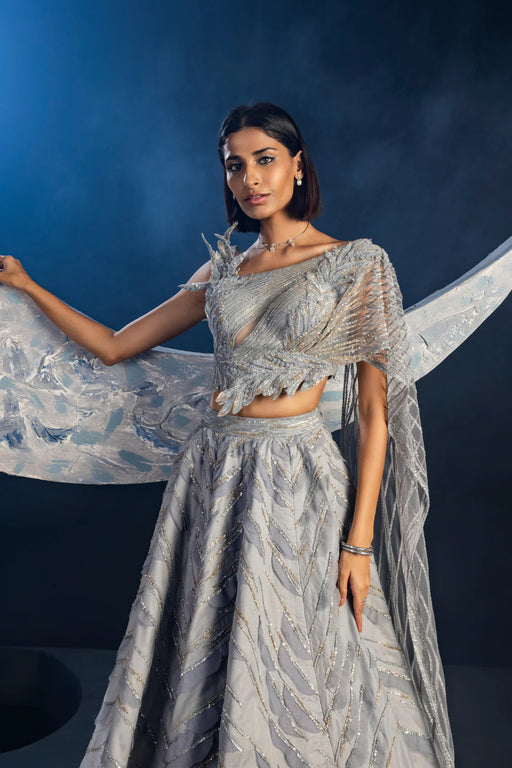 Powder Blue lehenga with alluring embroidery, having cutout details, and, leaf embellishments on top.