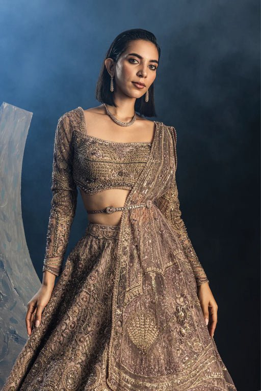 Satin Brown Bronze Moor Art Inspired Lehenga With Spiked Shoulder Feather's Detail on blouse.