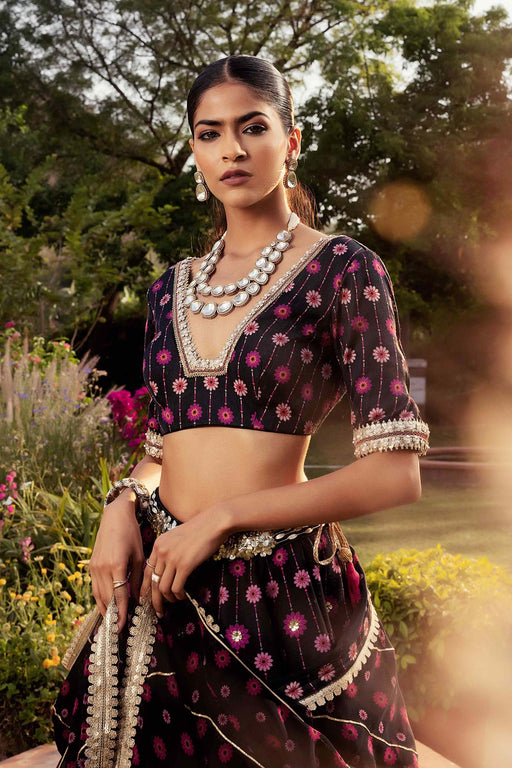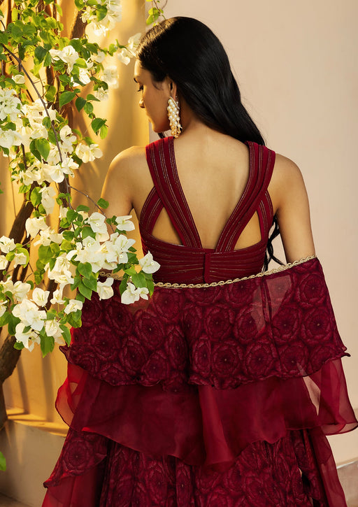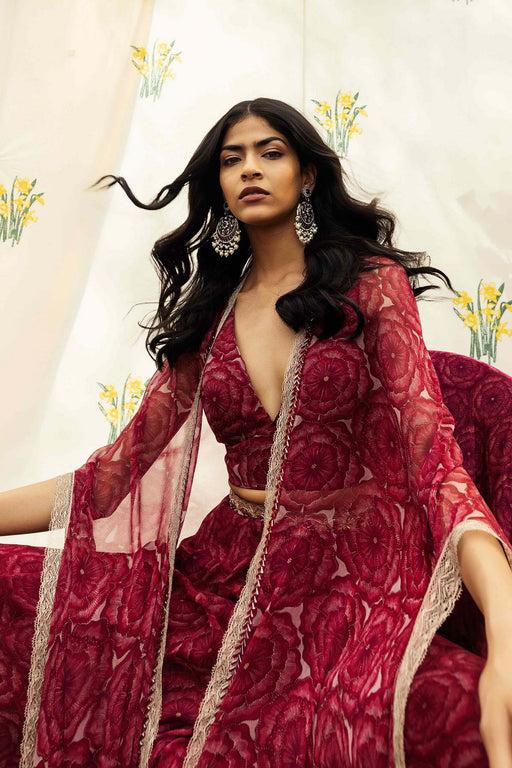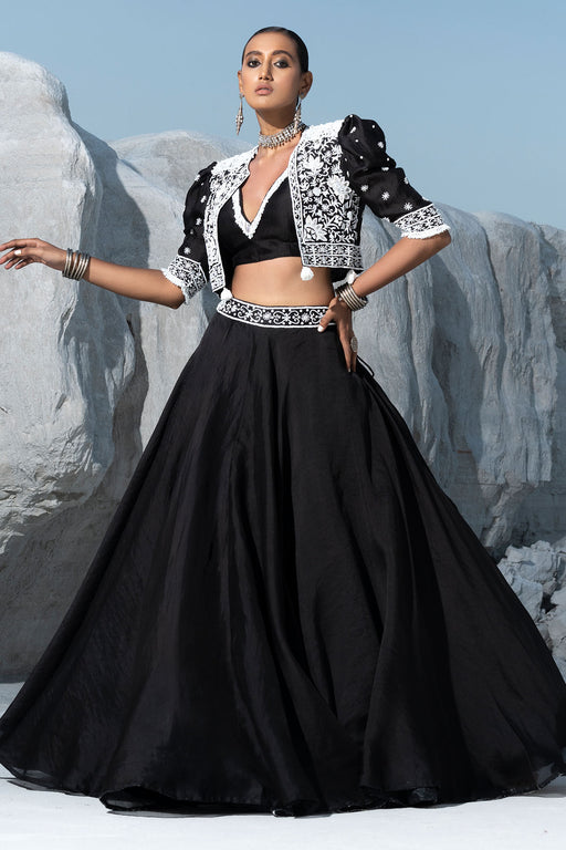 Featuring here a nude pink organza skirt with hand embroidered inner. This set has a printed jacket.