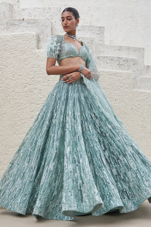 Powder Blue lehenga with alluring embroidery, having cutout details, and, leaf embellishments on top.