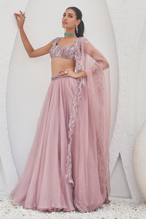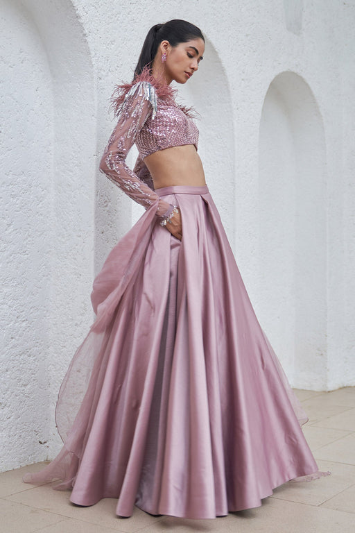 Dusky orchid sheeny blouse paired with a heavily embroidered elegant lehenga, and dupatta