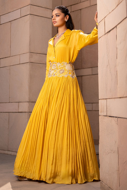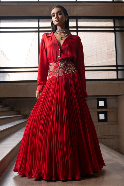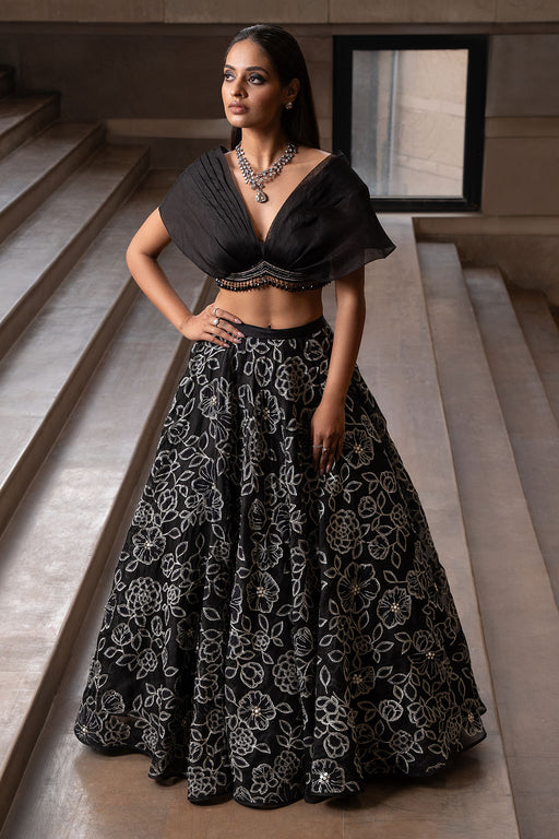 Featuring here an embroidered lehenga with pleated halter blouse. This set comes with a pre-draped stole