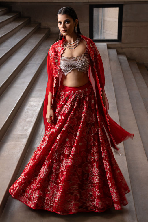 Hand embellished cape and blouse with dupatta and is paired with an embroidered waist belt around the skirt.