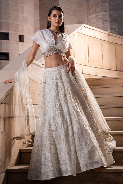 Cannoli Cream kali lehenga in pure silk and embellished with white and gold embroidery on bottom.