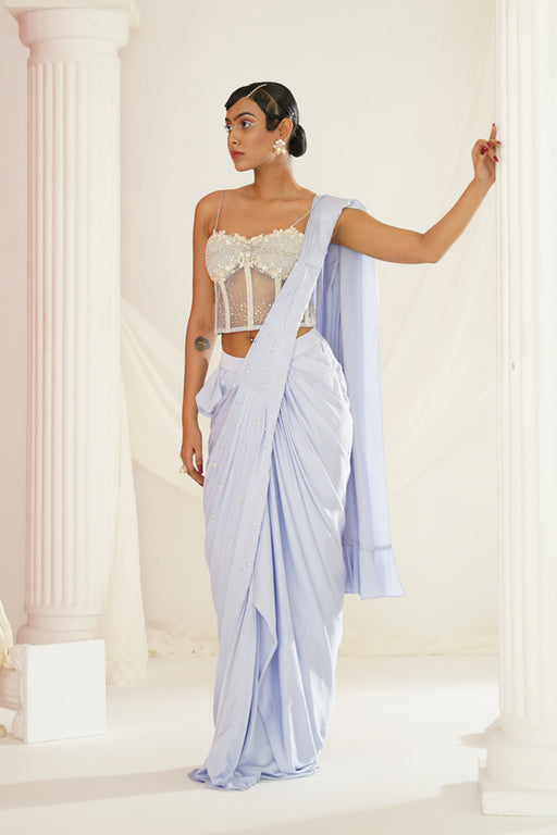 View full detailsKapda Dori's stunning Powder blue ready to wear armani satin saree, beautifully adorned with intricate pearl details and ruffle at pallu. The Powde...