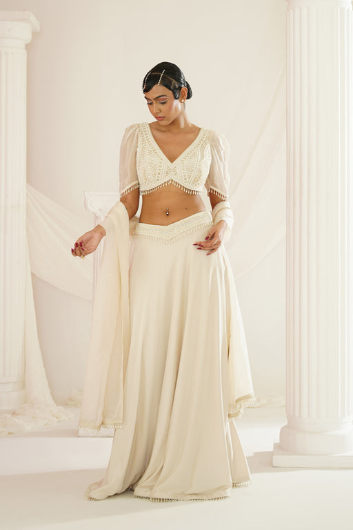 View full detailsKapda Dori's stunning ivory armani satin fabric lehenga and blouse, the lehenga belt is beautifully adorned with intricate crystal, stone, pearls a...