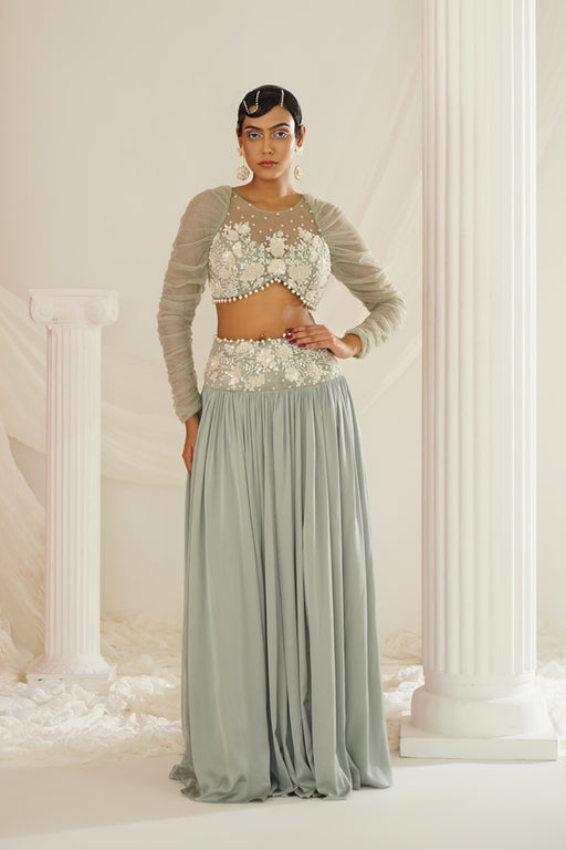 View full detailsKapda Dori's stunning sage green armani satin fabric lehenga and blouse, the lehenga belt is beautifully adorned with intricate crystal, stone, pea...