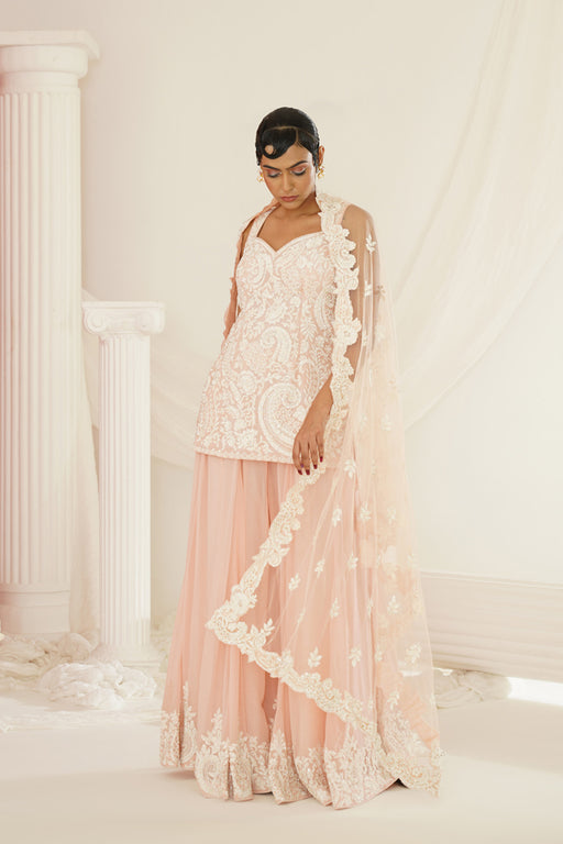 Kapda Dori's stunning blush pink geogratte fabric pallazo suit set, beautifully adorned with cutdana, sequence, resham and pearl embroidery. The pa...