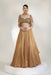 A striking blend of modern glamour and artisanal craft. This set features a plain skirt with an embroidered belt, styled with a noodle-strap blouse embellished with emerald stone embroidery and delicate bead hangings cascading from the shoulders. The applique-embroidered dupatta neckline adds a jewel-like grace, tying the look together with contemporary elegance.