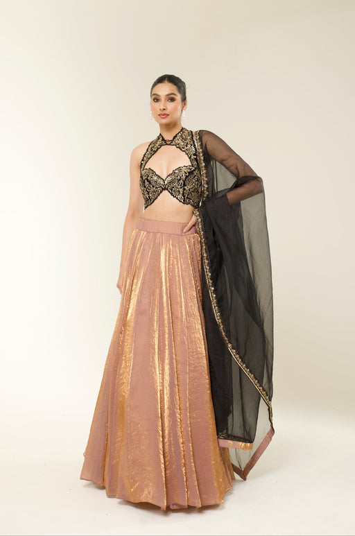 A sultry symphony in Black and rose gold — this hand-embroidered blouse with sculpted cuts pairs effortlessly with a flared skirt, organza dupatta ...