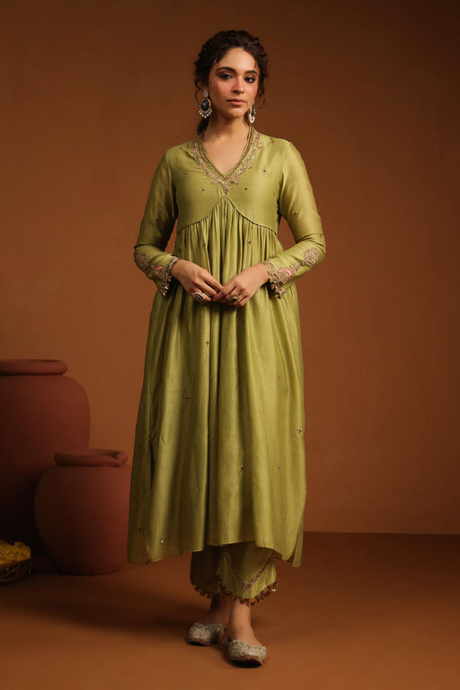This 2pc kurta set comes with heavily embroidered zardosi yoke and butis spread all over the kurta. The hem of the sleeves and pants are embellishe...