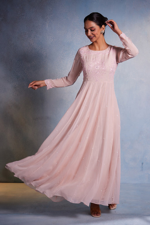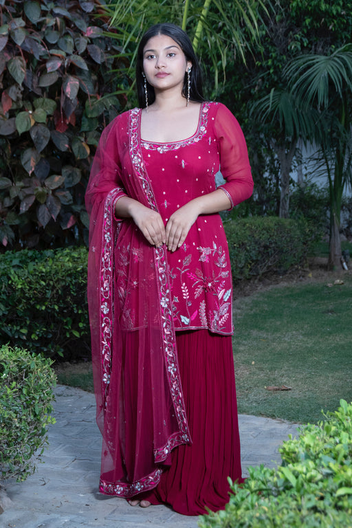 Handemroidered anarkali crafted from pure crepe, paired with a net dupatta. The anarkali is in a vibrant magenta pink color and features intricate ...