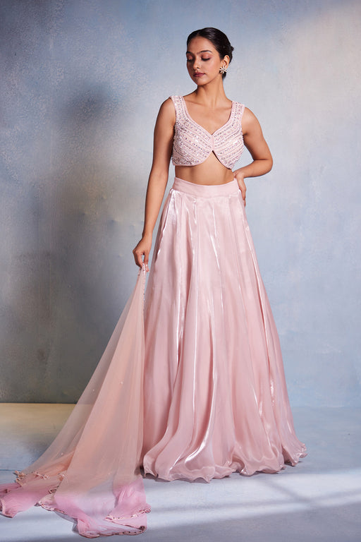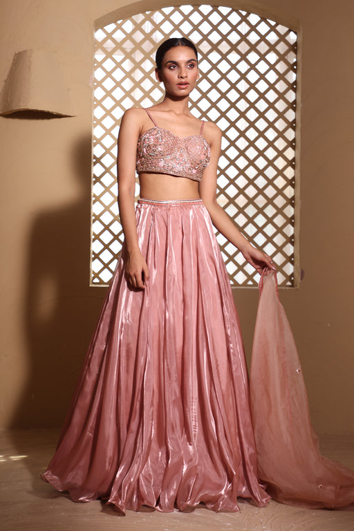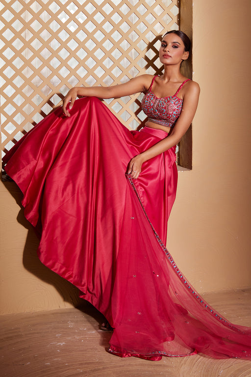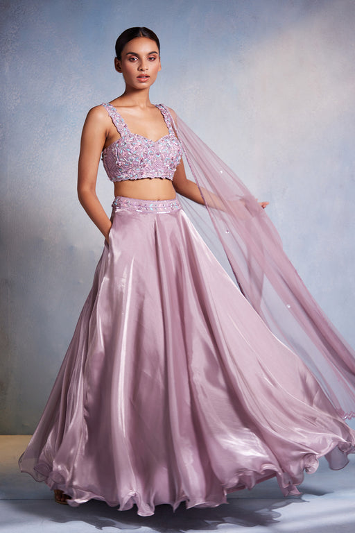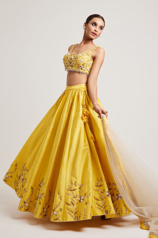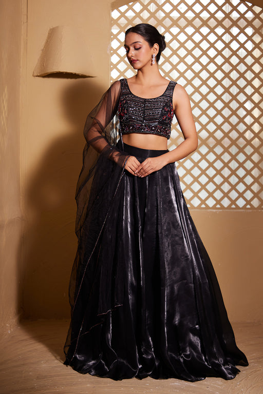 The Gul Lehenga by Muditaa By Urmila is a luxurious ethnic ensemble crafted from Italian satin. It features a net dupatta that is heavily adorned w...