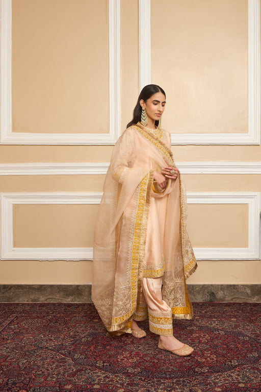 View full detailsFabrics. - Top- Bemberg Raw Silk. - Bottom- Muslin Silk. - Dupatta- Orgenza Silk. Product Description. - This set inc...