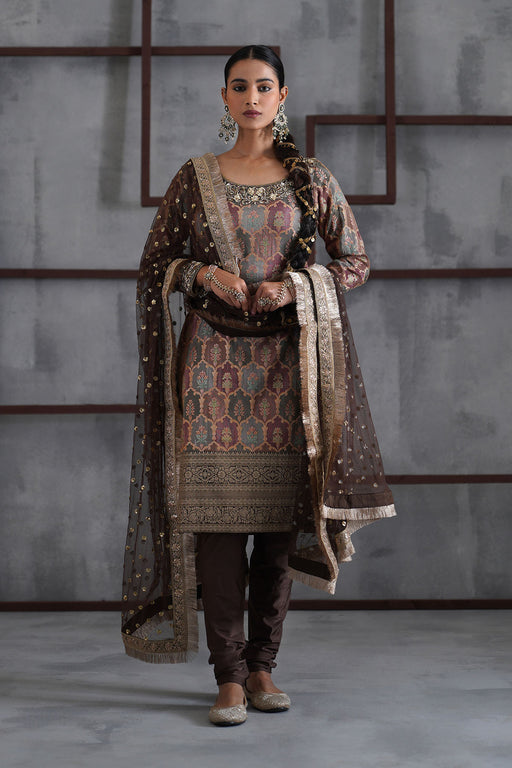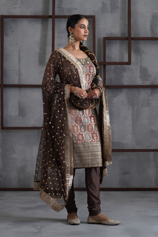 View full detailsDeepika Chadha's stunning Brown brocade kurti beautifully adorned intricate sequins, cutdana, beads, dabka , stones and zari embroidery on neckline...